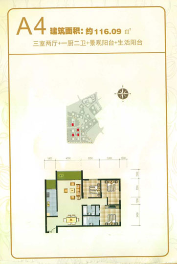 改善型戶型分為三居室和四居室兩種。其中三居室戶型有:A4(116.09㎡)、C3(106.4㎡)、E5(118.37㎡);四居室戶型有:A1(142.93㎡)、C1(155.61㎡)、C1’(160.69㎡)。這些戶型設計基本一致,最明顯的特點仍是方正設計,動靜功能分區(qū)明顯,景觀陽臺均與客廳相連,生活陽臺均與廚房相連。我們以116.09㎡的A4戶型為例來進行詳細分析。