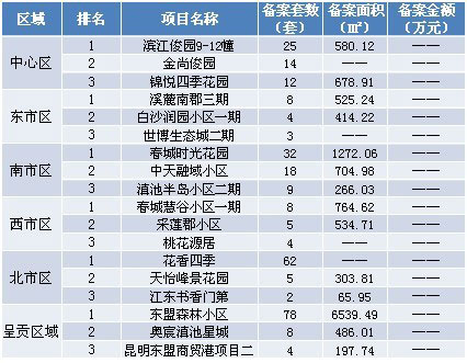 本周備案前三強(qiáng)分別位于呈貢、北市區(qū)與南市區(qū),排名先后順序?yàn)椋簴|盟森林小區(qū)、花香四季和春城時(shí)光花園。