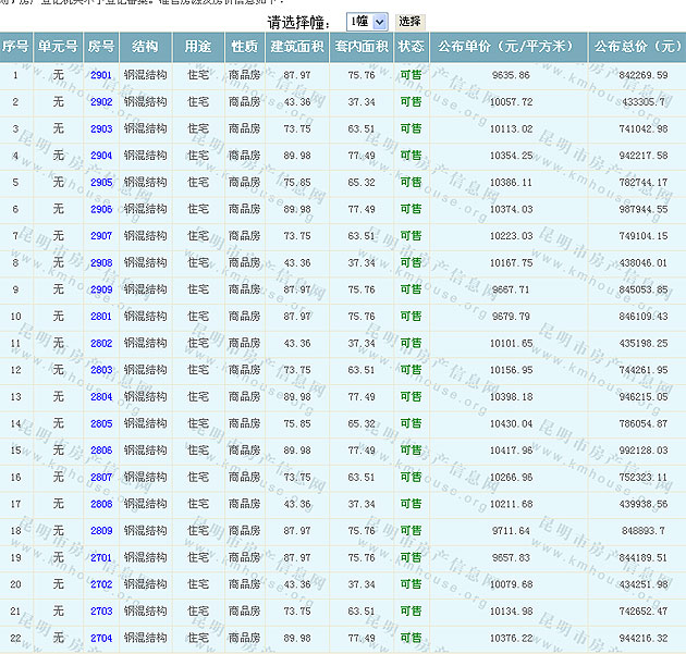 根據(jù)云南省物價局關于發(fā)布《云南省商品房銷售明碼標價實施細則(試行)》的通知,現(xiàn)將該項目商品住房的準售房源及每套房屋價格向社會公布,房地產(chǎn)開發(fā)企業(yè)應嚴格按照公布價格,商品房銷售明碼標價實行一套一標。商品房經(jīng)營者應當對每套商品房按照建筑面具進行明碼標價,否則,房產(chǎn)登記機關不予登記備案。準售房源及房價信息如下: