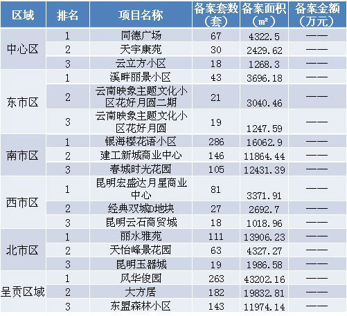 本周各區(qū)域房地產(chǎn)市場交易套數(shù)三強:本周備案前三強分別位于南市區(qū)與呈貢區(qū)域,排名先后順序為:銀海櫻花語小區(qū)、風華俊園和大方居。注:由于備案系統(tǒng)未公布成交金額,故備案金額暫時空白。
