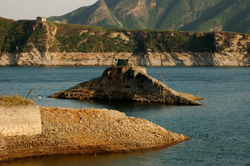 然而,我們來到潘家口,我們看到喜峰口,卻是脈脈溫熙,柔情波動——喜峰口和潘家口,這兩座唇齒相依的長城關(guān)隘,歷來都是兵家必爭之地。但在1983年,引灤入津水利工程潘家口水庫大壩竣工(當(dāng)年號稱國內(nèi)第三大壩),灤河水位上漲,一時高峽出平湖,山谷間的喜峰口和潘家口兩座關(guān)城,都被淹在碧波底下。四周峰巒起伏,一線長城,在山脊踴躍,突然探身伏下,臨波則繾綣,潛入水底,又竄出湖面,游上對岸的峰巒山脊,折身回望,湖中聳起一座有敵臺的小島,在波光鱗鱗中與兩岸的長城敵臺遙相呼應(yīng)。