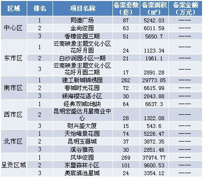 本周各區(qū)域房地產(chǎn)市場(chǎng)交易套數(shù)三強(qiáng):本周備案前三強(qiáng)分別位于呈貢與南市區(qū),排名先后順序?yàn)椋猴L(fēng)華俊園、建工新城錦繡園和東盟森林小區(qū)。注:由于備案系統(tǒng)未公布成交金額,故備案金額暫時(shí)空白。