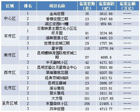 本周各區(qū)域房地產(chǎn)市場交易套數(shù)三強(qiáng):本周備案前三強(qiáng)分別位于呈貢與西市區(qū),排名先后順序?yàn)椋捍蠓骄、東盟森林小區(qū)和昆明宏盛達(dá)月星商業(yè)中心。注:由于備案系統(tǒng)未公布成交金額,故備案金額暫時(shí)空白。