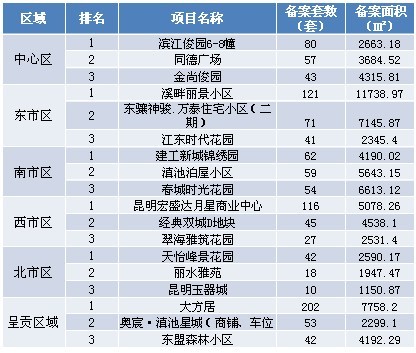 本周各區(qū)域房地產(chǎn)市場交易套數(shù)三強:本周備案前三強分別位于呈貢、東市區(qū)與西市區(qū),排名先后順序為:大方居、溪畔麗景小區(qū)與昆明宏盛達月星商業(yè)中心。注:由于備案系統(tǒng)未公布成交金額,故備案金額暫時空白。