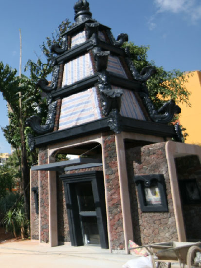 賦予東南亞風(fēng)格的琉璃燈塔,其作為標(biāo)志性的主入口,富于東南亞風(fēng)格的保安亭,設(shè)計(jì)運(yùn)用契合櫻花語(yǔ)案名的櫻花圖案,彩色琉璃與紅色火山巖,在材質(zhì)肌理碰撞出設(shè)計(jì)的火花,配以精心的燈光設(shè)計(jì),使之在滿足實(shí)際功能性的同時(shí)兼顧景觀的觀賞性,成為櫻花語(yǔ)社區(qū)獨(dú)一無(wú)二的景觀元素。