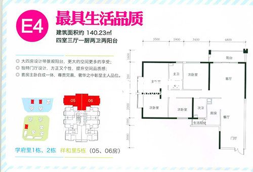 140.23平米的E4戶型為四室三廳一廚兩衛(wèi)兩陽臺(tái)設(shè)計(jì),分布于學(xué)府里(C地塊)1、2棟05、06號(hào)房。從戶型圖上看,該戶型雖然也具備動(dòng)靜區(qū)分,餐廳、景觀陽臺(tái)與客廳緊密以及廚房與生活陽臺(tái)連通的特點(diǎn),但總體來看,戶型不夠方正,入戶門廳與餐廳連接的地方如不設(shè)計(jì)好,容易造成空間,且臥室之間的過道處有小部分的空間浪費(fèi)。