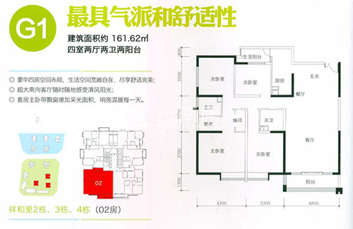 161.62平米的G1戶型為四室兩廳兩衛(wèi)兩陽臺(tái)設(shè)計(jì),分布于祥和里(D地塊)2、3、4棟02號(hào)房,端頭房,兩面采光。從戶型圖上看該戶型設(shè)計(jì)較為方正,動(dòng)靜區(qū)分明顯,從入戶門玄關(guān)處即可進(jìn)入廚房,干濕分離明顯。