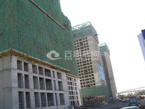 放眼望去,五棟在建的建筑聳立在半空,尤其是靠近曇華寺的那棟已經(jīng)褪去紗網(wǎng)的建筑遠(yuǎn)遠(yuǎn)的就能看見,而該棟建筑的底層就是項目售樓部,由于項目還在施工因此入口處被一片藍(lán)色的擋板分割開來,不過這并不影響購房者進(jìn)入售樓部。