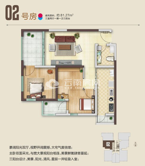 81.27平米的戶型分布于每層的02號房,與79.23平米三室兩廳一廚一衛(wèi)三陽臺的戶型相對,區(qū)別在面積大小2平米以及于朝向相反。