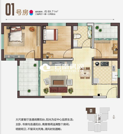 89.71平米的戶型分布在每層的01號房,與87.78平米戶型對稱分布,二者的空間布局是一模一樣的,但89.71平米面對的是小區(qū)主景觀,視野更開闊。