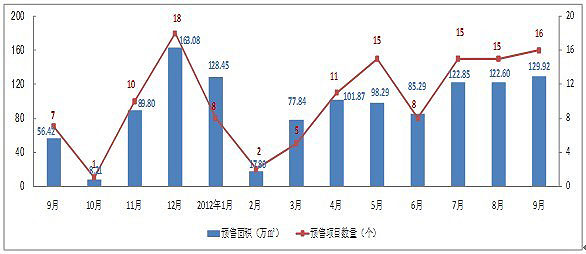 2012年9月房地產(chǎn)市場(chǎng)整體供應(yīng)129.92萬(wàn)㎡,環(huán)比增長(zhǎng)5.97%,同比去年9月,供應(yīng)面積增加了73.50萬(wàn)㎡,同比增長(zhǎng)56.57%。9月共有16個(gè)項(xiàng)目通過(guò)預(yù)售審批,過(guò)批項(xiàng)目多位于南市區(qū)域中心區(qū),其中南市區(qū)有7個(gè)項(xiàng)目通過(guò)審批規(guī)劃;從物業(yè)類(lèi)別來(lái)看,主要是住宅物業(yè),僅聚龍商貿(mào)中心1個(gè)商業(yè)項(xiàng)目。