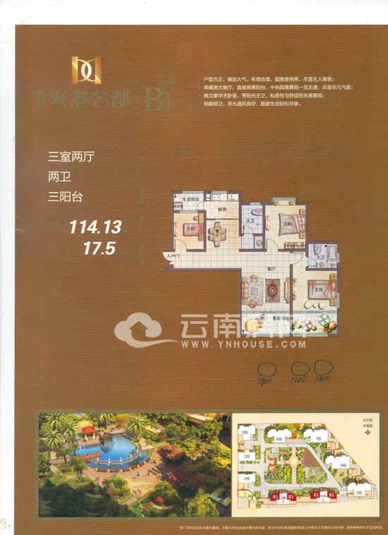B1戶型為三房兩廳兩衛(wèi)三陽臺114.13平米,陽臺面積占17.5平米。該戶型主要分布在3棟、3A棟,戶型布局還算合理。寬大的客廳直接連著景觀陽臺,景觀陽臺面寬3.9米,面積大約在7平米左右,在景觀陽臺上便可覽盡中央院落景觀。主臥室?guī)И毩⑿l(wèi)生間,私密性強,而且是明衛(wèi),通風好,不用擔心臥室會有異味,主臥與一個月6.5平米的景觀陽臺相接,采光、通風都比較不錯。廚房連接生活陽臺,放置拖布和洗衣機也很方便。該戶型不足的是一進門便是臥室,私密性會受到影響,且該臥室面積只有9平米,狹小的面積住起來比較壓抑。另外客廳、餐廳、陽臺并沒有成一條直線,導致過道太長,空間有些浪費。