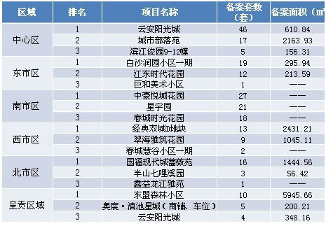 本周各區(qū)域房地產(chǎn)市場(chǎng)交易套數(shù)三強(qiáng):本周備案前三強(qiáng)分別位于中心區(qū)和南市區(qū),排名先后順序?yàn)椋涸瓢碴?yáng)光城、中豪悅城花園與星宇園。注:由于備案系統(tǒng)未公布成交金額,故備案金額暫時(shí)空白。