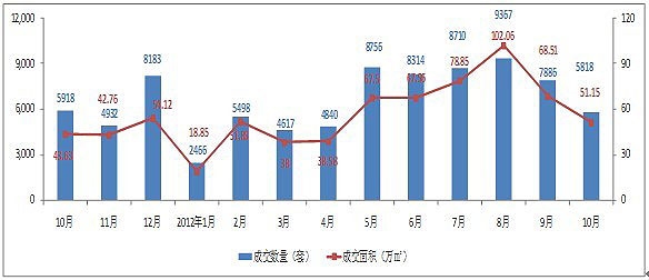2012年10月昆明市房地產(chǎn)市場合計備案5818套,比上月減少2068套,環(huán)比下降26.22%,與去年同期相比備案數(shù)量減少100套,同比下降1.69%;10月成交面積為51.15萬㎡,比上月減少17.36萬㎡,環(huán)比下降25.34%,但去年同期增加7.52萬㎡,同比增長17.24%。