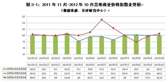 圖3-1:2011年11月-2012年10月昆明商業(yè)價(jià)格指數(shù)走勢圖(數(shù)據(jù)來源:至祥研究中心)
